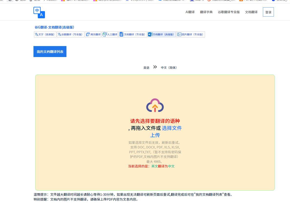 第一步,打開(kāi)工具網(wǎng)頁(yè),上傳需要翻譯的PDF;