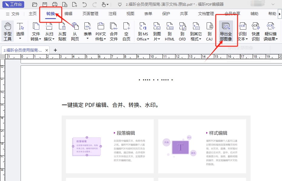 打開(kāi)PDF文檔之后,點(diǎn)擊【轉(zhuǎn)換】中的【導(dǎo)出全部圖像】,然后就確認(rèn)導(dǎo)出的路徑之后,之后點(diǎn)擊確認(rèn),就可以將PDF中所有的圖片全部導(dǎo)出到本地保存。