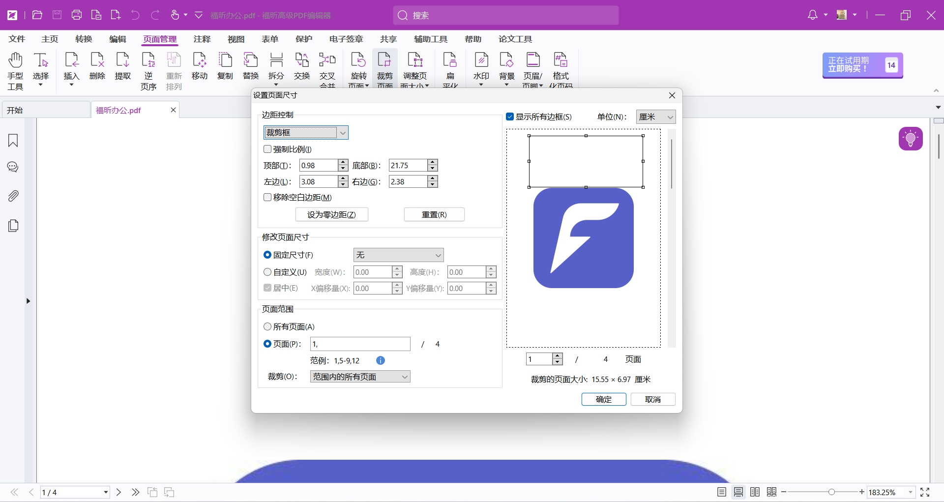 在進入彈窗之后,大家還可以根據不同的邊距和其他的參數設置來完成PDF頁面的裁剪。裁剪結束之后別忘記保存PDF文檔。