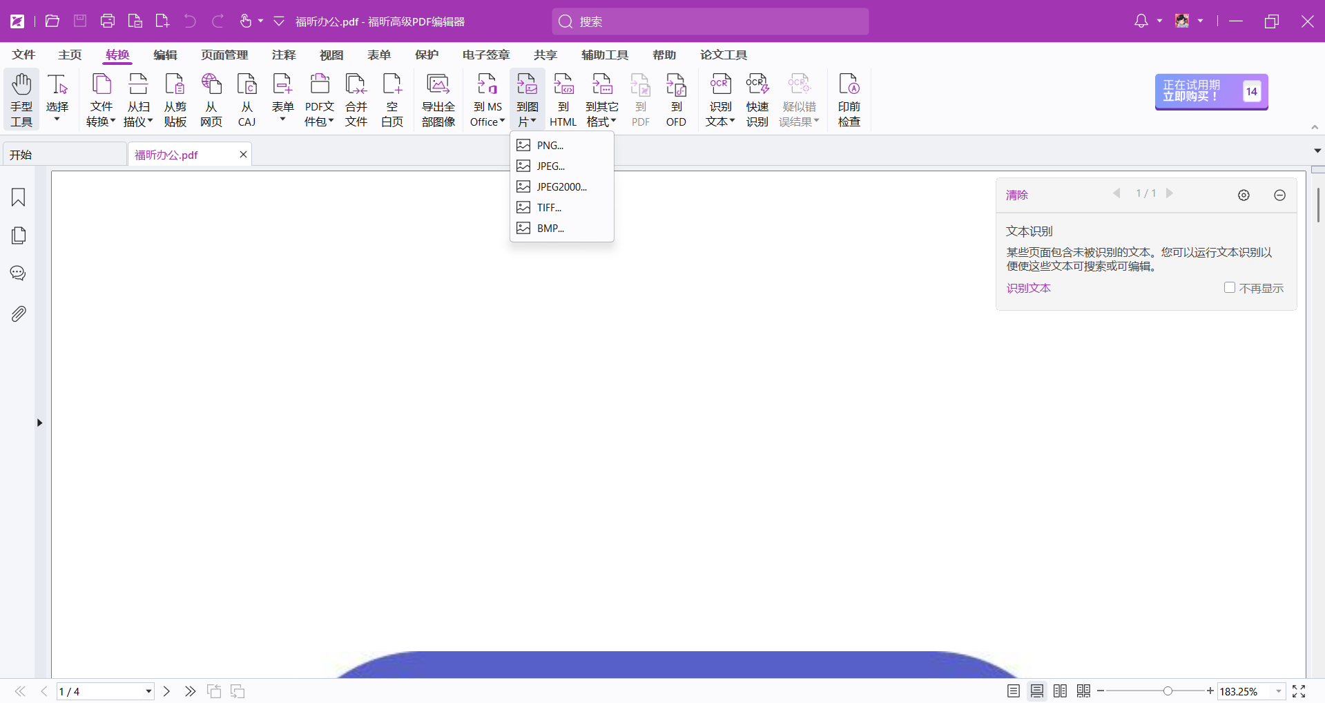 打開PDF文檔之后,我們可以點(diǎn)擊【轉(zhuǎn)換】中的【到圖片】,然后根據(jù)自己的需求來選擇圖片的格式。