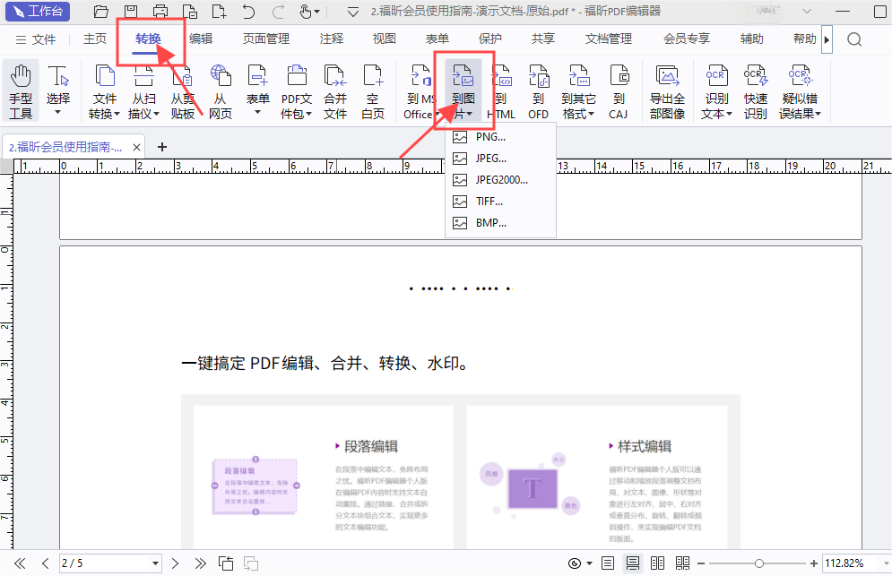 打開(kāi)PDF文檔之后,我們可以點(diǎn)擊【轉(zhuǎn)換】中的【到圖片】,然后根據(jù)自己的需求來(lái)選擇圖片的格式。