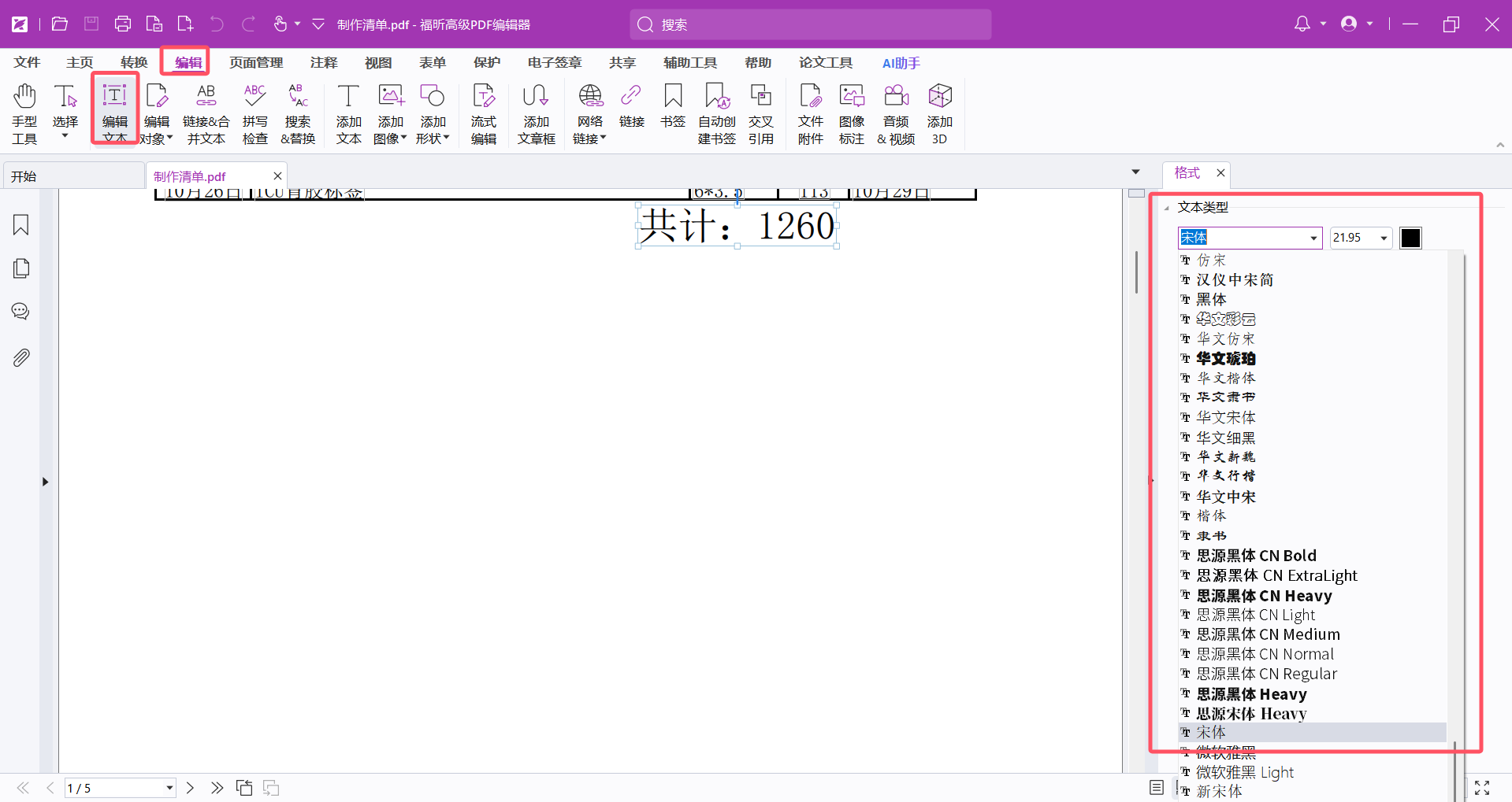 打開PDF文檔之后,我們可以點擊【編輯】,然后根據(jù)需要編輯的內(nèi)容選擇好編輯對象,之后就像編輯Word一樣編輯PDF文檔了。